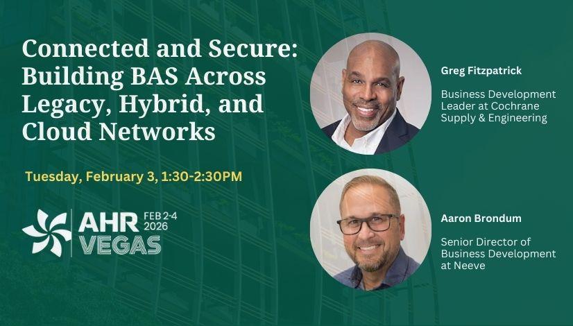Aaron Brondum to speak at AHR 2026 Automated Buildings will host Neeve’s Aaron Bondum and Cochrane’s Greg Fitzpatrick for a featured industry seminar, Connected and Secure: Building BAS Across Legacy, Hybrid, and Cloud Networks on Tuesday, February 3, from 1:30 PM – 2:30 PM at AHR.
